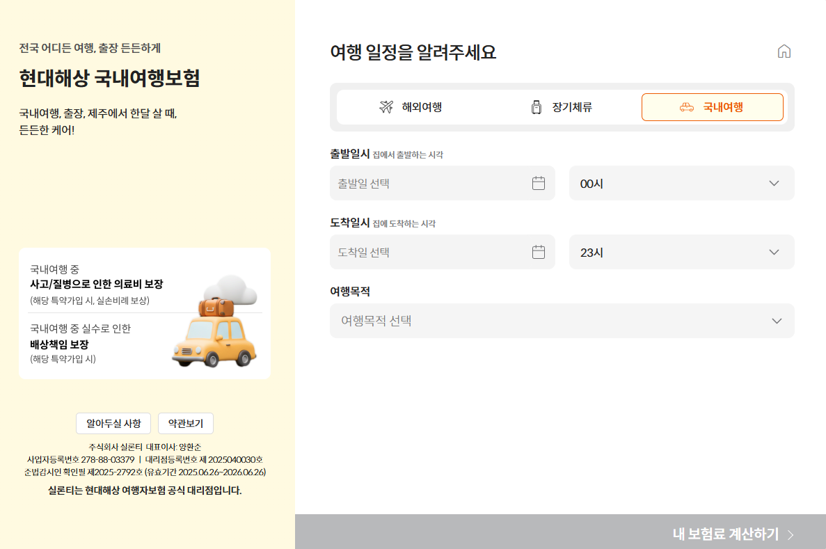실시간 보험료 계산은 현대해상 다이렉트 보험료 계산기에서 확인할 수 있으며, 플랜별 비교 후 즉시 결제가 가능합니다. 보험증권은 카카오톡 또는 이메일로 자동 발급되어 공항에서도 바로 확인이 가능합니다.
