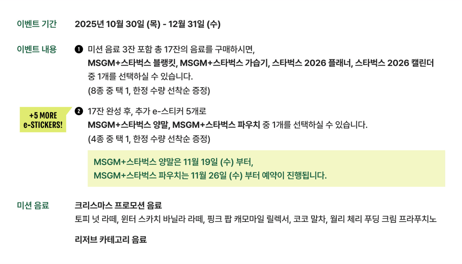| 적립 기간 | 2025.11.05 ~ 2026.01.07 | 음료 결제 시 e-스티커 자동 적립 |