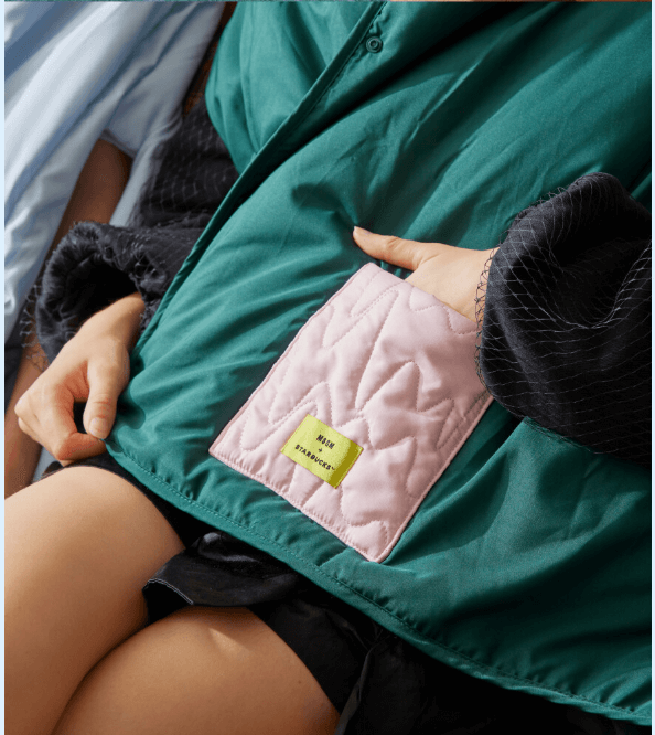 리사이클 폴리에스터 소재로 제작된 부드러운 블랭킷. MSGM의 로고 자수와 스타벅스의 컬러 조합이 돋보입니다. 휴대용 파우치 세트로 제공되어 이동 중에도 사용하기 좋습니다.